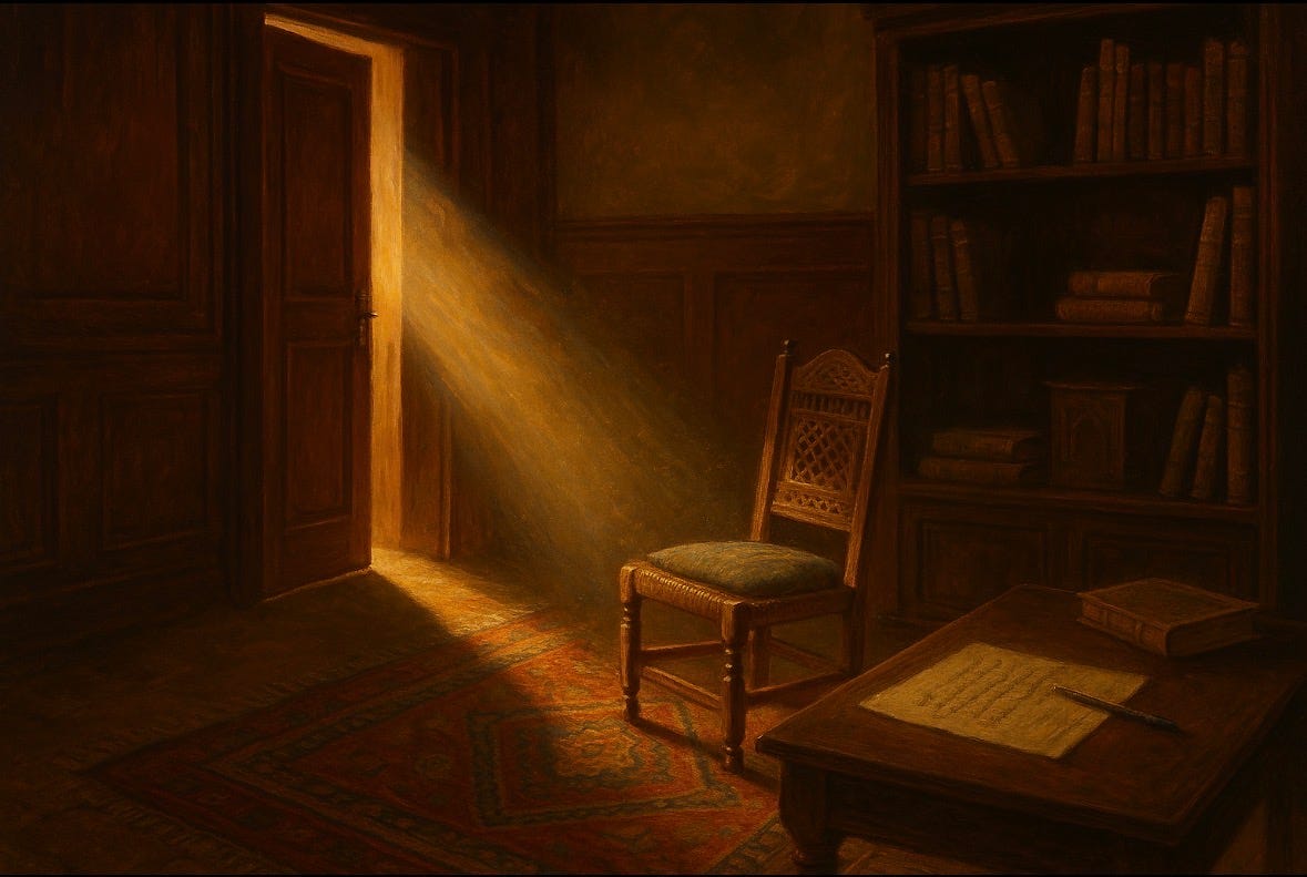 تعجّبت من البدر في هذا النّص، لأن فيه خيال واسع جدًّا، خيال لا يأتي بالتأمل البسيط، ف انا مُتأكد ان البدر قضى ايام كثيرة يتأمل ذلك المنظر، منظر النور الخجول وهو يدخل الغرفة ويزحف حتى يصل ل السجّادة والكرسي.